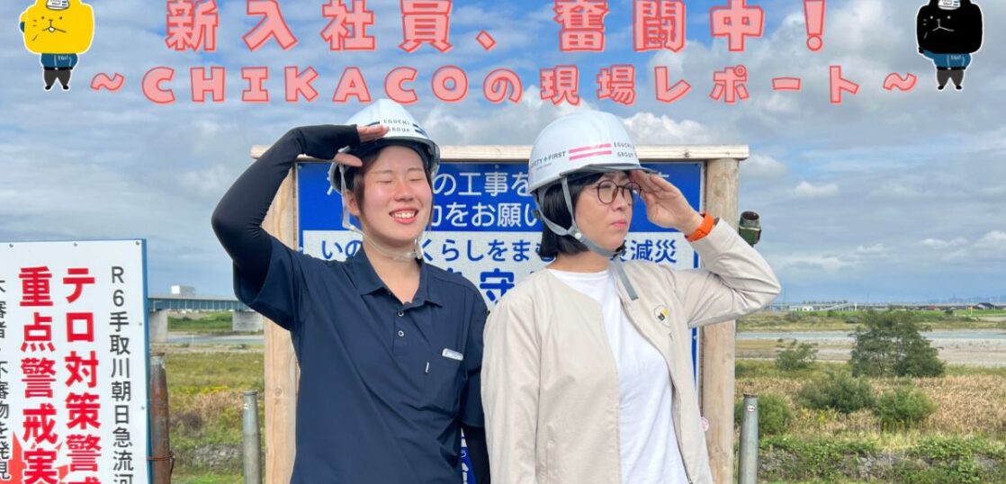 江口組のYouTubeチャンネルで公開中の「CHIKACOの現場レポート」では、手取川の現場で奮闘する新入社員の加戸さんの姿を紹介しています。