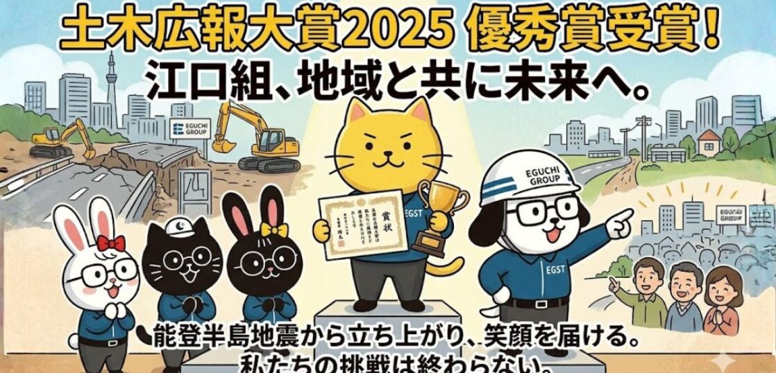 「この受賞は、現場で頑張った仲間たち、県内建設会社の皆さま、そして温かい声を寄せてくださった皆さまのおかげです。」