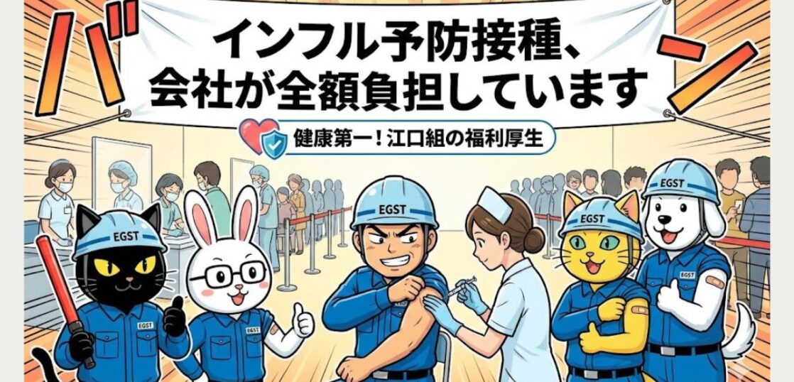 江口組では、社員が元気に働き続けられるように、インフルエンザの予防接種費用を会社が全額負担しています。