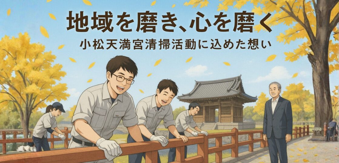 社員のみんな、そして江口組を支えてくださる安全協議会の皆さんと一緒に、小松天満宮の清掃活動を行いました。