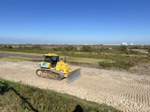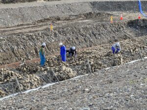 法面(斜面)の前面に土を加えて安定させる「腹付け盛土」を行い、